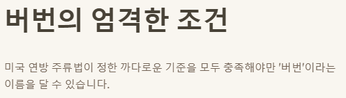 - ✅ 버번은 미국에서 51% 이상 옥수수와 새까맣게 태운 오크통으로만 숙성해야 하는 엄격한 법규를 따라요.