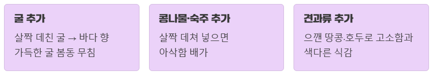 - 굴 추가: 신선한 굴을 살짝 데쳐 함께 무치면 바다 향 가득한 굴 봄동 무침이 됩니다.