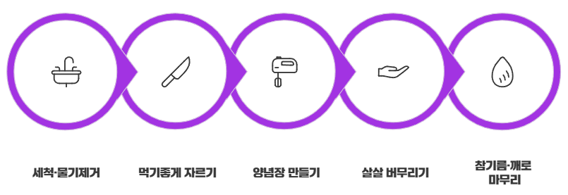 4. 살살 버무리기: 풋내 나지 않도록 가볍게, 먹기 직전에 무치는 것이 좋아요.