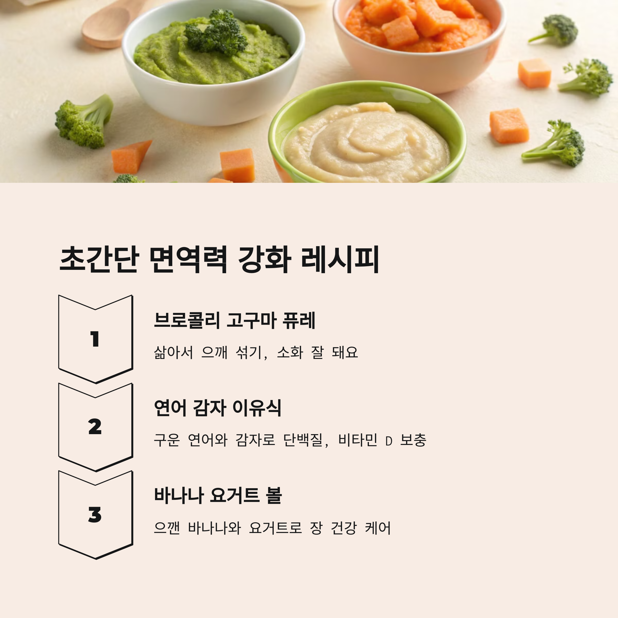 바나나 요거트, 고구마 스틱, 아보카도 퓨레 등이 좋아요. 이들은 자연식이면서도 면역력 강화에 도움을 줄 수 있는 영양소를 포함하고 있습니다.