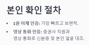 증권사에서 본인 명의의 기존 은행 계좌로 1원을 이체하면서, 입금자명에 적힌 4~5자리 숫자를 앱에 입력하는 방식이에요. '0000(증권사)' 이런 식으로 입금자명이 뜨는데, 이 숫자를 입력하면 됩니다. - 영상 통화 인증: 증권사 직원과 영상 통화를 통해 신분증과 본인 얼굴을 대조하여 확인하는 방식입니다.