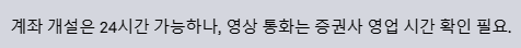 대부분 24시간 개설이 가능하지만, 본인 확인 절차(특히 영상 통화)는 증권사 영업 시간에만 가능할 수 있으니 미리 확인해두는 것이 좋아요.