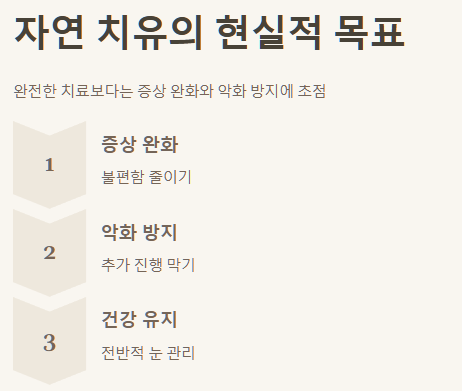 비문증은 아직 확실한 치료법이 없어서 레이저 시술이나 수술을 고려하기도 하지만, 부작용의 위험도 무시할 수 없어요. 그래서 많은 분이 자연 치유나 완화 방법을 찾으시는 것 같아요. 저 역시 그랬고요. 자연 치유라고 해서 비문증이 아예 사라지는 것을 기대하기보다는, 증상 완화와 추가적인 악화를 막는 데 초점을 맞추는 것이 현실적이라는 생각이 듭니다. 그럼, 어떤 방법들이 있을까요?