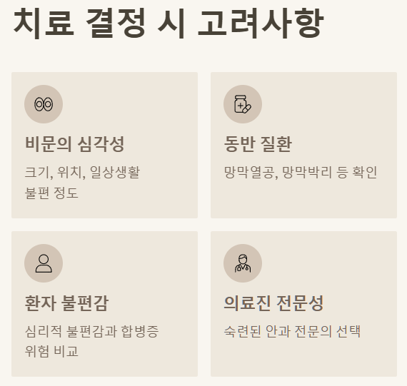 동반 질환 유무 망막열공, 망막박리, 유리체 출혈 등 심각한 안과 질환이 동반되어 있는지 여부가 치료 결정에 가장 중요한 요소입니다.