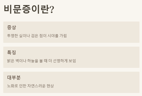 • 1. 비문증은 대부분 노화 현상이지만, 심각한 질환의 신호일 수 있어요. 정밀 검진은 필수!