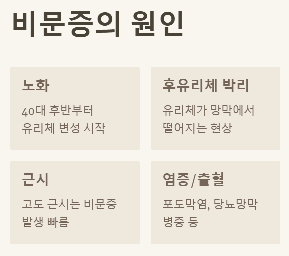 - 노화: 가장 흔한 원인으로, 40대 후반부터 발생률이 증가해요. 유리체가 자연스럽게 변성되는 과정이죠.