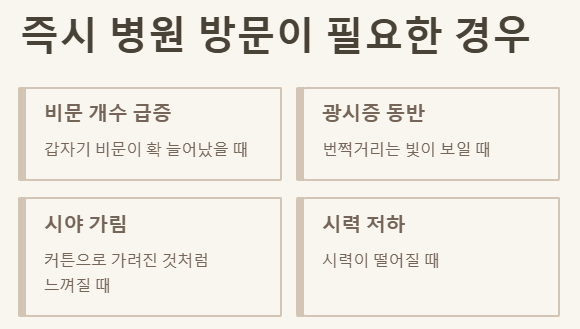 • 2. 갑작스러운 증상 변화(개수 증가, 광시증 동반, 시야 가림) 시 즉시 병원 방문이 중요해요. 망막 질환 가능성을 배제할 수 없어요.
