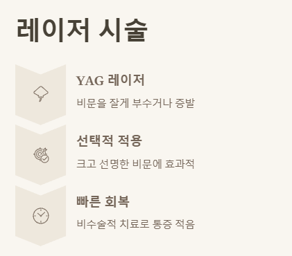 - 단점: 모든 비문에 효과적인 것은 아니며, 여러 번의 시술이 필요할 수 있어요. 또한, 드물지만 시술 후 눈의 압력 상승이나 망막 손상 같은 합병증 위험이 있습니다.