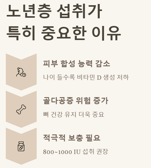 | 노년층 (65세 이상) | 800~1000 IU | 합성 능력 감소, 골다공증 예방 |