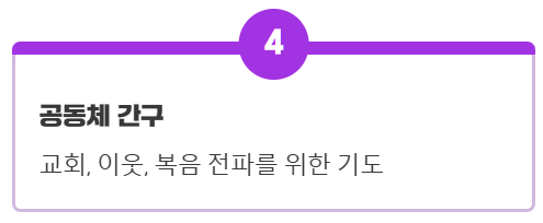 - ✅ 핵심 원칙 준수: 성경적 근거, 회개와 용서, 감사와 찬양, 그리고 공동체와 세상을 위한 간구를 균형 있게 포함해야 합니다.