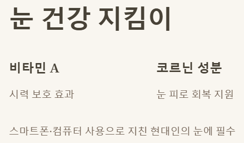 - ✅ 눈 건강 지킴이: 비타민 A와 코르닌으로 시력 보호 및 눈 피로 회복에 기여.