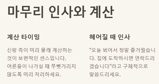 | 마무리 | ✅ 식사 후 감사의 인사 전달 | 헤어질 때까지 예의 지키기 |