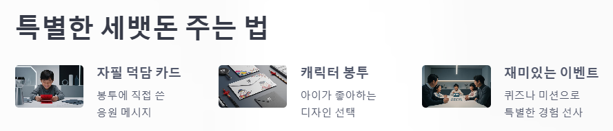 봉투에 덕담을 자필로 적어주거나, 아이들이 좋아하는 캐릭터가 그려진 봉투를 준비하는 등 작은 디테일이 아이들에게는 더 큰 기쁨으로 다가올 수 있답니다.