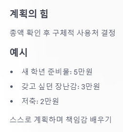 예를 들어, '새 학년 준비물 5만원, 갖고 싶었던 장난감 3만원, 나머지 2만원은 저축' 이런 식으로요.
