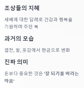 이는 가족 간의 유대감을 돈독히 하고, 서로의 복을 기원하는 의미로 볼 수 있습니다.