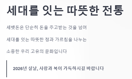 이처럼 세뱃돈은 세대를 잇는 소중한 전통이자, 가족의 사랑을 확인하는 매개체가 아닐까 싶어요.