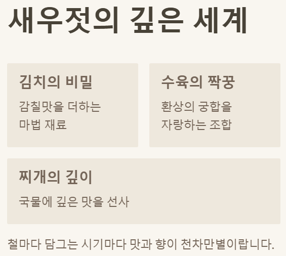 - 추젓: 음력 9~10월 가을 새우, 개운하고 시원한 맛, 만능 양념으로 일상 요리에 적합!