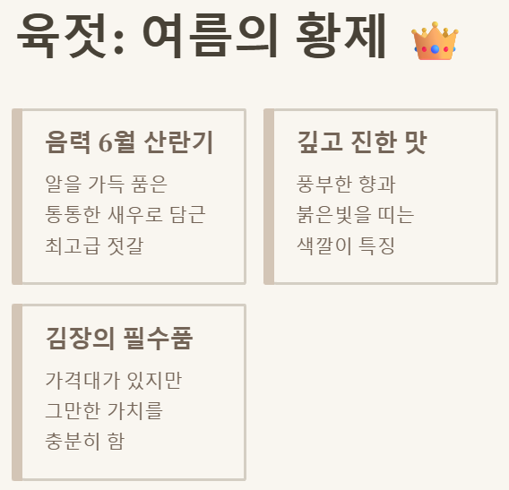 - 육젓: 음력 6월 알배기 새우, 깊고 진한 감칠맛과 풍미, 김장 김치와 수육에 필수!