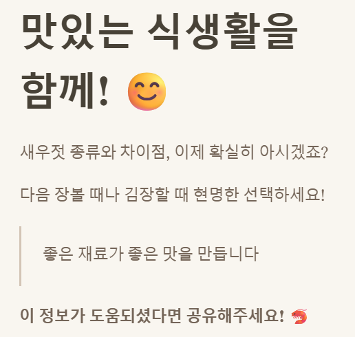 오늘 새우젓 종류와 그 차이점에 대한 이야기가 여러분의 식탁을 더욱 풍성하게 만드는 데 도움이 되었으면 좋겠어요. 다음번 장을 볼 때나 김장을 담글 때, 오늘 배운 내용들을 떠올리며 현명한 새우젓 선택을 하시길 바랍니다! 맛있는 식생활, 함께 만들어나가요! 감사합니다. 😊