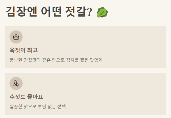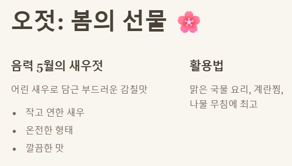 - 오젓: 음력 5월 어린 새우, 부드럽고 깔끔한 감칠맛, 맑은 국/계란찜에 최고!
