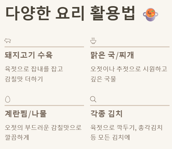 - 맑은 국/찌개: 오젓이나 추젓은 찌개나 국의 간을 맞추는 데 아주 좋아요. 특히 순두부찌개나 콩나물국에 넣어주면 국물이 훨씬 시원하고 깊어진답니다.
