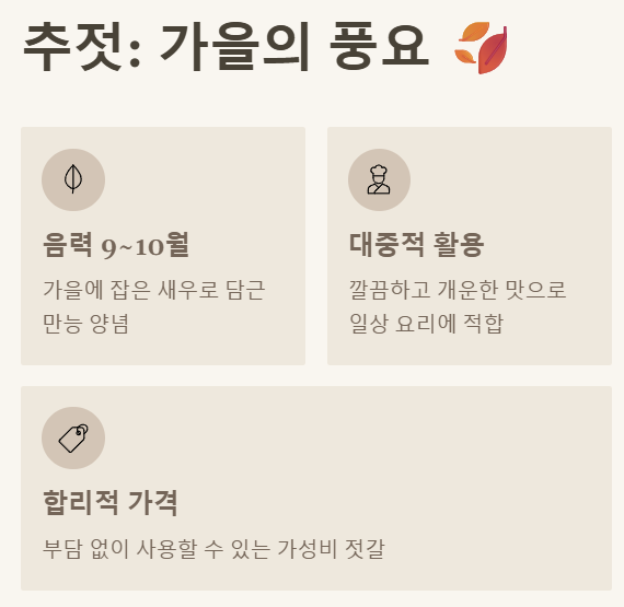 - 추젓: 음력 9~10월 가을 새우, 개운하고 시원한 맛, 만능 양념으로 일상 요리에 적합!