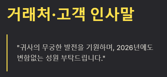 • 거래처/고객에게: 번창을 기원하고 좋은 관계를 기대하는 "귀사의 무궁한 발전을 기원하며, 2026년에도 변함없는 성원 부탁드립니다. 새해 복 많이 받으세요."