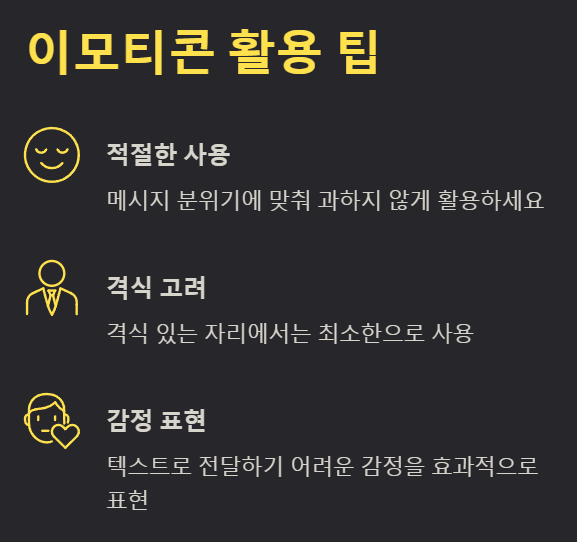 이모티콘을 사용할 때는 과하지 않게, 메시지의 분위기에 맞춰 적절히 활용하는 것이 중요해요. 격식 있는 자리에서는 최소한으로 사용하거나 아예 사용하지 않는 것이 좋겠죠.