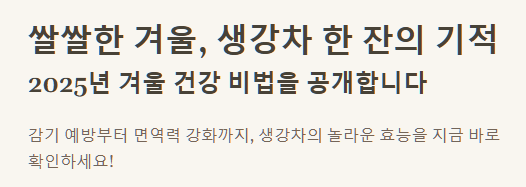 요즘 같은 날씨에 아침마다 으슬으슬한 기운을 느낄 때가 많아요. 제 생각엔 이럴 때 따뜻한 생강차 한 잔만큼 좋은 게 없는 것 같아요. 매년 겨울이 되면 저희 집은 늘 생강 냄새로 가득하거든요. 아마 많은 분들이 저처럼 생강차를 단순히 '몸을 따뜻하게 하는 차' 정도로만 생각하실 텐데요, 사실 생강차는 그 이상의 놀라운 건강 효능을 가지고 있답니다.