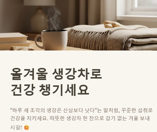 올겨울은 따뜻한 생강차 한 잔으로 감기 없이 건강하게 보내시길 바랍니다. 더 궁금한 점이나 여러분만의 생강 활용 꿀팁이 있다면 댓글로 남겨주세요~ 😊