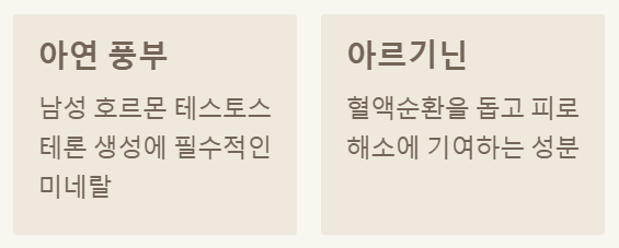 • 1. 남성 활력 증진: 풍부한 아연과 아르기닌이 자양강장 및 피로 회복에 도움을 줍니다.