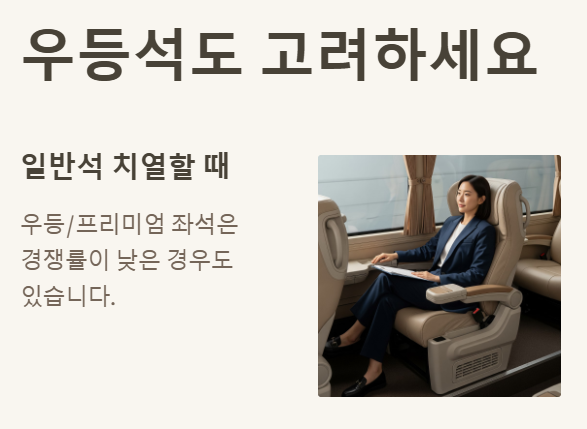 일반 좌석이 치열할 때, 우등이나 프리미엄 좌석은 경쟁률이 낮은 경우도 있습니다. 편안한 귀성길을 위해 투자하는 것도 좋은 전략이죠.
