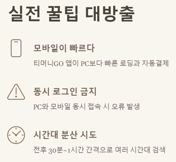 PC 웹사이트보다 티머니GO 앱이 빠른 로딩과 자동결제 기능으로 성공률을 높여줍니다. 앱이 더 쾌적할 때가 많아요.