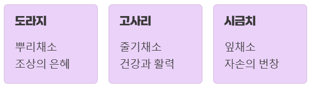 뿌리채소인 도라지는 조상의 은혜를, 줄기채소인 고사리는 건강과 활력을, 잎채소인 시금치는 자손의 번창을 상징한다고 하죠.