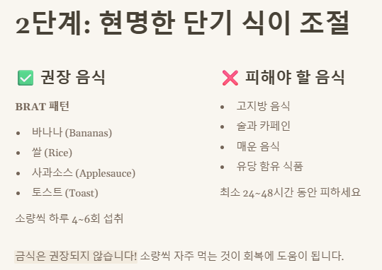 - 금식은 NO! BRAT 식단처럼 순한 음식을 소량씩 자주 섭취.
