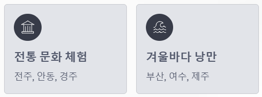 - 겨울바다 낭만: 부산, 여수, 제주에서 시원한 바다와 신선한 해산물을 즐겨보세요.
