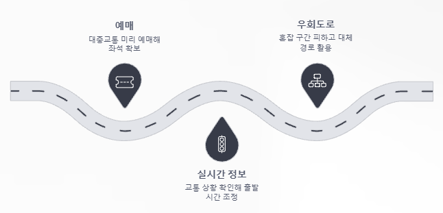 - 자가용: 출발 전 실시간 교통 정보를 확인할 수 있는 앱(카카오내비, T맵 등)은 필수!