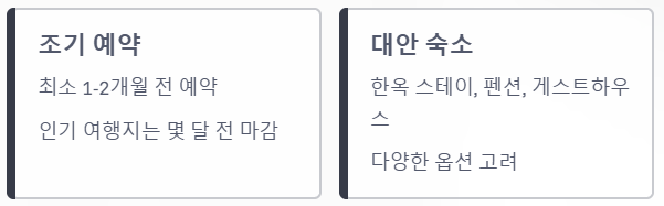 - 대안 숙소: 호텔 외에 한옥 스테이, 펜션, 게스트하우스 등 다양한 옵션을 고려해보세요.