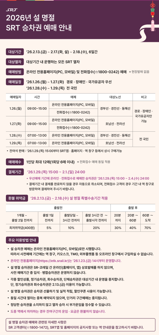 SRT 예매는 SR 홈페이지, 모바일 웹, SRT 앱에서 가능하고, 교통약자분들은 사전등록(1월 16일~22일) 후 전화(1800-0242)로도 예매할 수 있어요. 중요한 건, 코레일과 마찬가지로 명절 기간(1월 13일~2월 18일 승차권)에는 역 창구나 대리점 예매가 불가하다는 점이에요. 예매 전에 미리 로그인해두고 결제 수단도 등록해두면 시간에 쫓기지 않고 예매할 수 있을 거예요.