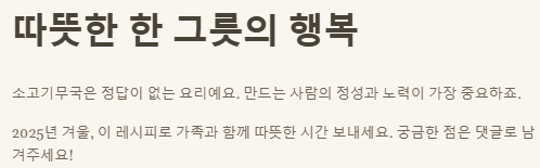 찬 바람이 부는 2025년 겨울, 따끈한 소고기무국 한 그릇으로 가족과 함께 행복한 시간을 보내시길 바라요. 맛있게 만들어 드시고 궁금한 점은 댓글로 남겨주세요!