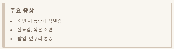 가장 흔한 원인 중 하나로, 특히 여성에게 잦습니다. 세균 감염으로 인한 염증이며, 소변 시 통증, 잔뇨감, 잦은 소변 증상이 동반돼요. 발열이나 옆구리 통증이 있다면 의심해야 합니다.