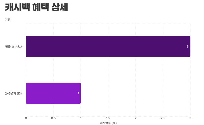 | 캐시백 | 발급 후 1년 3% (최대 10만원) 발급 후 2~5년 1% (연 최대 6만원) |