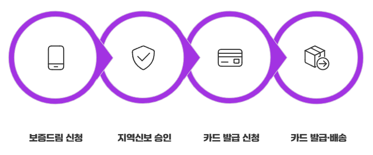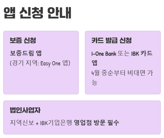 보증 승인이 나면 IBK기업은행에 카드 발급을 신청해야 하는데요, 현재는 영업점 방문이 필요하지만 오는 2026년 4월 중순부터는 IBK기업은행 ‘i-One Bank’ 또는 ‘IBK 카드’ 앱을 통해 비대면 신청도 가능해질 예정이에요. 정말 편리해질 것 같죠? - Step 4: 카드 발급 및 배송 (IBK기업은행 → 소상공인)