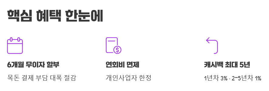 - 6개월 무이자 할부: 사업 운영에 필요한 목돈 결제 시 부담을 크게 덜 수 있는 최대 6개월 무이자 할부 혜택이 그대로 유지됩니다.