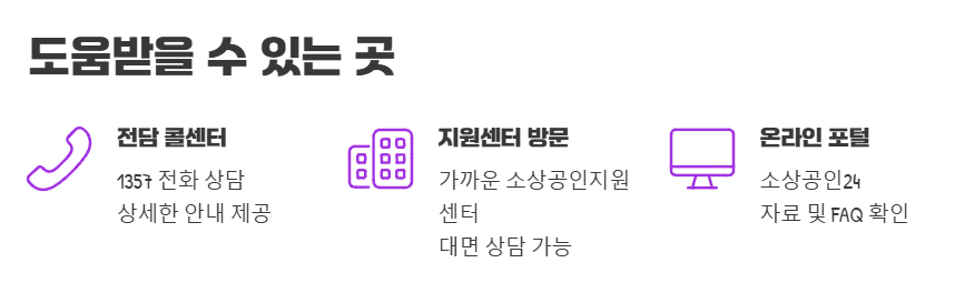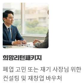 - 📜 희망리턴패키지: 폐업을 고민하시거나 재기하려는 사장님들을 위한 컨설팅 및 재창업 바우처입니다.