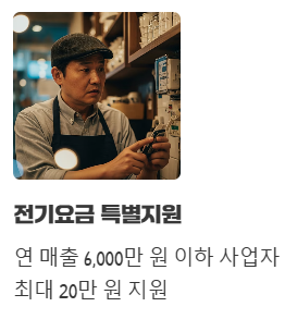 - ⚡ 소상공인 전기요금 특별지원: 연 매출 6,000만 원 이하 사업자에게 최대 20만 원의 전기요금을 지원합니다.