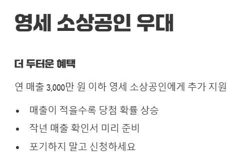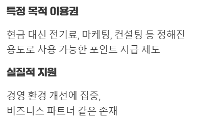 현금으로 직접 주는 지원금과는 달리 정해진 용도(전기료, 마케팅, 컨설팅 등)에 맞춰 결제할 수 있다는 점이 특징이죠.