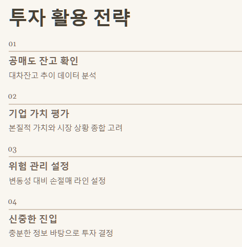 - 위험 관리: 만약 내가 보유한 종목의 공매도 비중이 높다면, 숏커버링으로 인한 급등락 가능성뿐만 아니라, 예상치 못한 악재 시 공매도가 더 늘어나 주가 하락 압력이 커질 위험도 함께 고려해야 합니다.