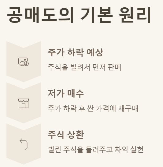 - 공매도 (Short Selling): 주가 하락 예상 시 주식을 빌려 팔고, 하락 후 다시 사서 갚아 차익 실현.