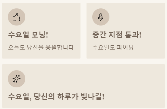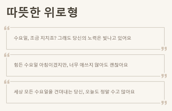 - "수요일, 조금 지치죠? 그래도 당신의 노력은 빛나고 있어요. 따뜻한 커피 한 잔처럼 포근한 하루 보내세요. ☕"